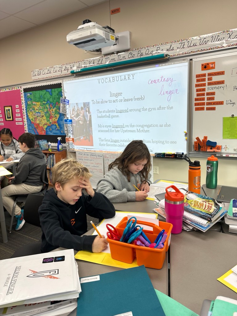 In language arts, we learned several vocabulary words this week. Sometimes, we look them up in the dictionary, and other times we copy the information from slides. Every time, students write definitions and create original sentences to share.