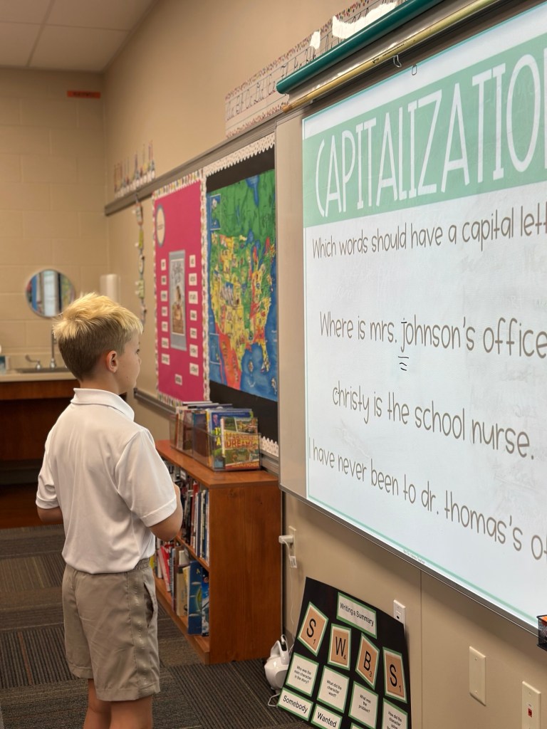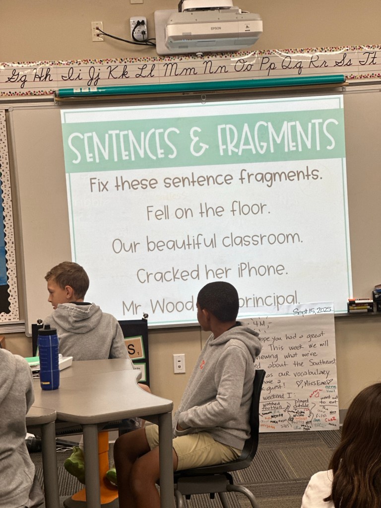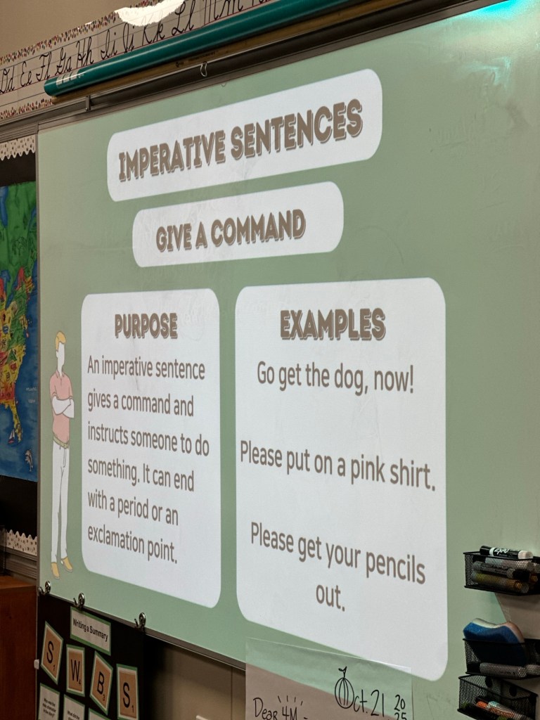 We also learned the four types of sentences (declarative, imperative, interrogative, exclamatory) and practiced identifying with sentences from our book and our social studies text. We also worked on adding the correct punctuation to each type.